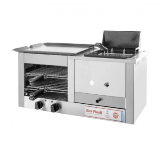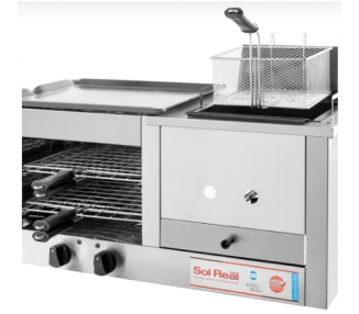 Carlitero Múltiple con Freidora - Gabinete de acero inoxidable esmerilado. - 1 canasto freidor de acero de 24 x 24 x 12cm. - Plancha bifera - Incluye 1 pinza carlitera de 32 x 38 cm. - 2 robinetes. - Peso Neto: 20,8 kg. - Kilocalorías 8.800