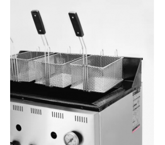 Freidora 33 Automática Cuádruple Inyección SKU 245A - Gabinete 100% acero inoxidable esmerilado. - 2 Canastos de acero (1 de 24 x 24 x 12cm. + 1 de 24 x 18 x 12cm) - Desagote con llave esférica de bronce. - Llave de paso de gas interior. - Válvula de seguridad. - Puerta inferior desmontable. - Tacho de acero inoxidable. - Tubos quemadores: 4 - 16 Inyectores + Piloto. - Peso Neto: 27...