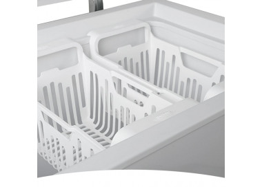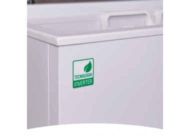 Freezer familiar de 406 litros de capacidad útil, tapa de apertura superior y canastos internos para mejor organización. Modelo de alta rotación en el mercado minorista por su tamaño ideal para hogares, con bajo consumo energético y excelente rendimiento de congelado.