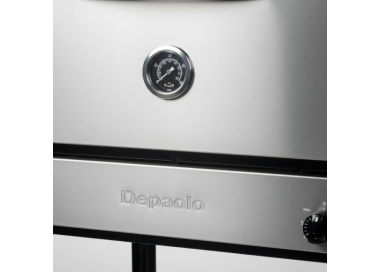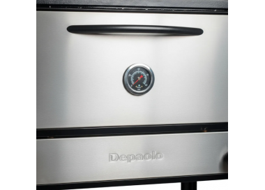 Puerta desmontable de acero inoxidable con manija de madera, bisagras irrompibles y pirómetro analógico.