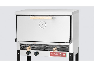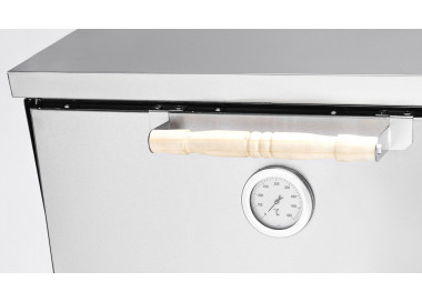 Puerta desmontable con manija de madera, bisagras irrompibles y pirómetro analógico.