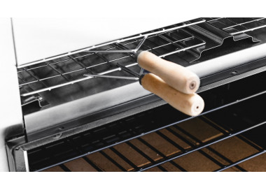 Puerta desmontable con manija de madera, bisagras irrompibles y pirómetro analógico.