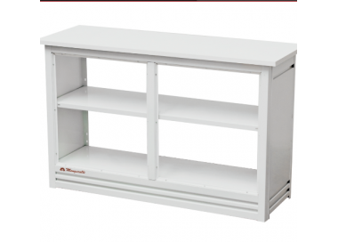 Estructura metálica de color blanco pintados con pintura epoxi con polvo con una mesada de madera de melamina blanca sobre aglomerado.